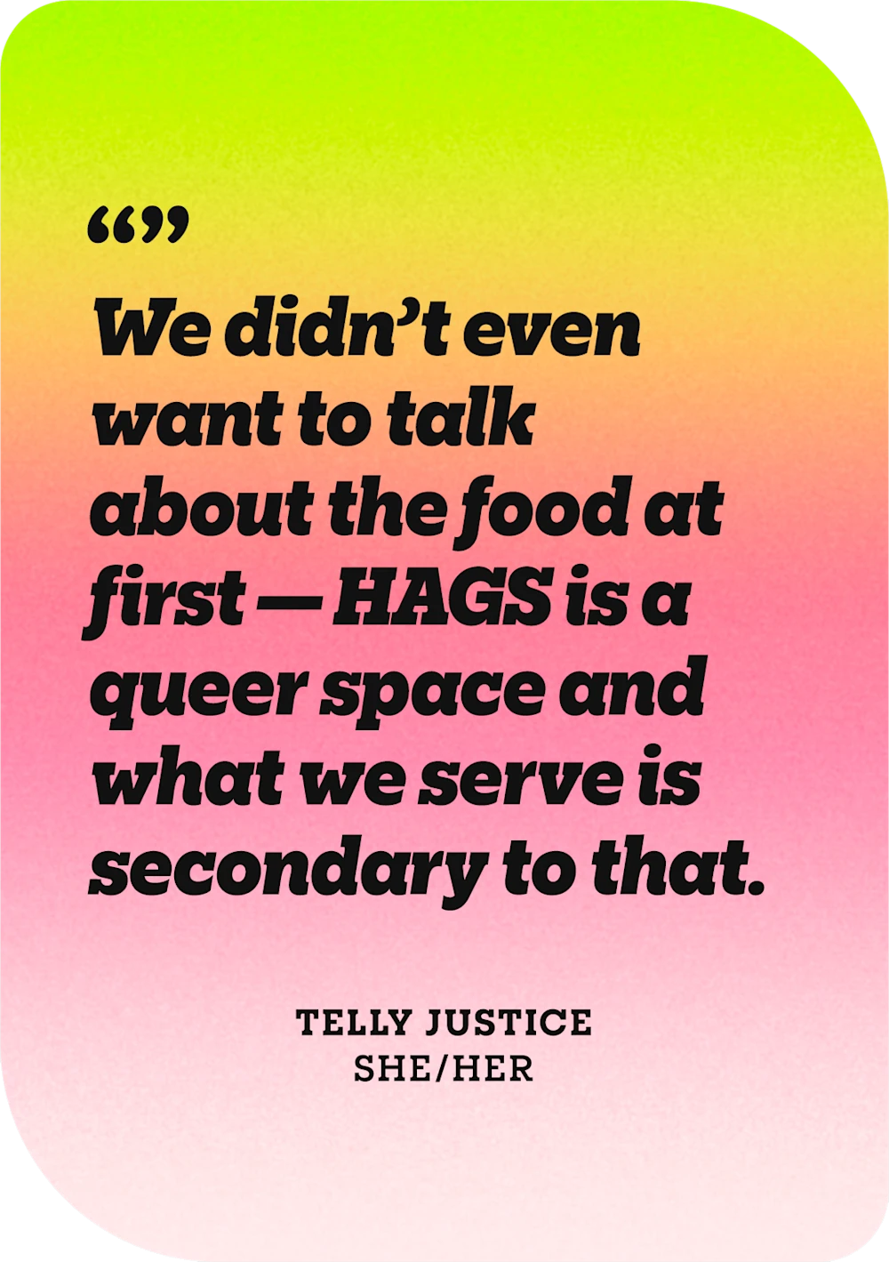 HAGS opened in the summer of 2022, with Justice in the kitchen and Lindsley taking charge of beverages. “We didn’t even want to talk about the food at first—HAGS is a queer space and what we serve is secondary to building that," Justice says.