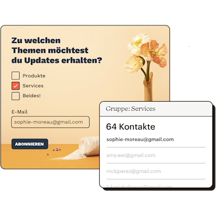 Indem du in deine Mailchimp-Registrierungsformulare benutzerdefinierte Felder einfügst, kannst du deinen Kontakten die Möglichkeit bieten, dir ihre Vorlieben mitzuteilen. Außerdem kannst du Kontakte innerhalb deiner Zielgruppe anhand bestimmter Interessengruppen organisieren.