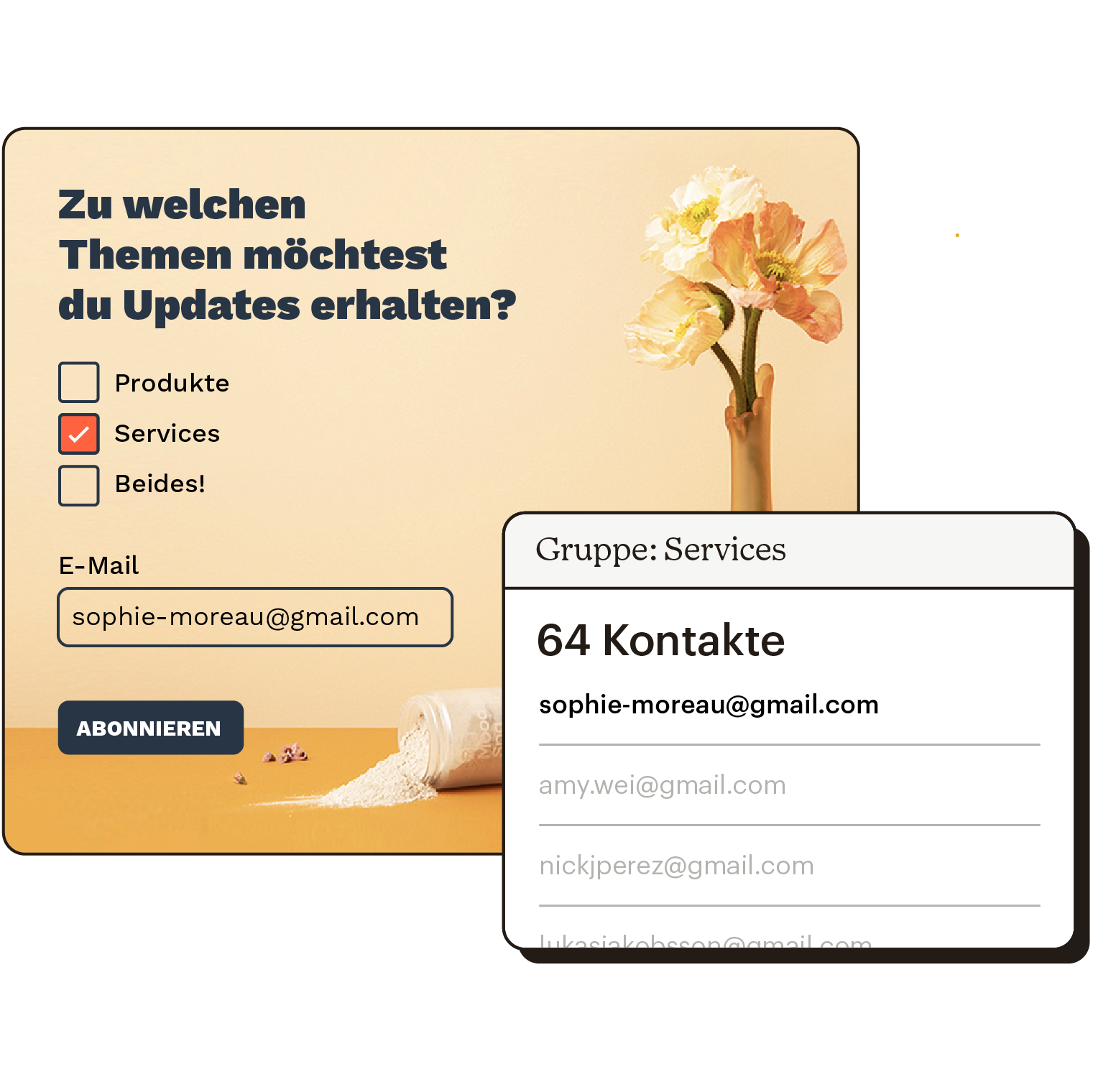 Indem du in deine Mailchimp-Registrierungsformulare benutzerdefinierte Felder einfügst, kannst du deinen Kontakten die Möglichkeit bieten, dir ihre Vorlieben mitzuteilen. Außerdem kannst du Kontakte innerhalb deiner Zielgruppe anhand bestimmter Interessengruppen organisieren.