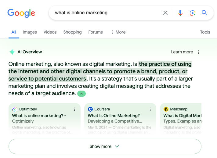 Aber es ist nicht unmöglich, in der Google SGE gelistet zu werden. „Die KI-Übersicht funktioniert nicht von Zauberhand“, sagt Bryson Meunier, Senior Marketing Manager bei QuickBooks: