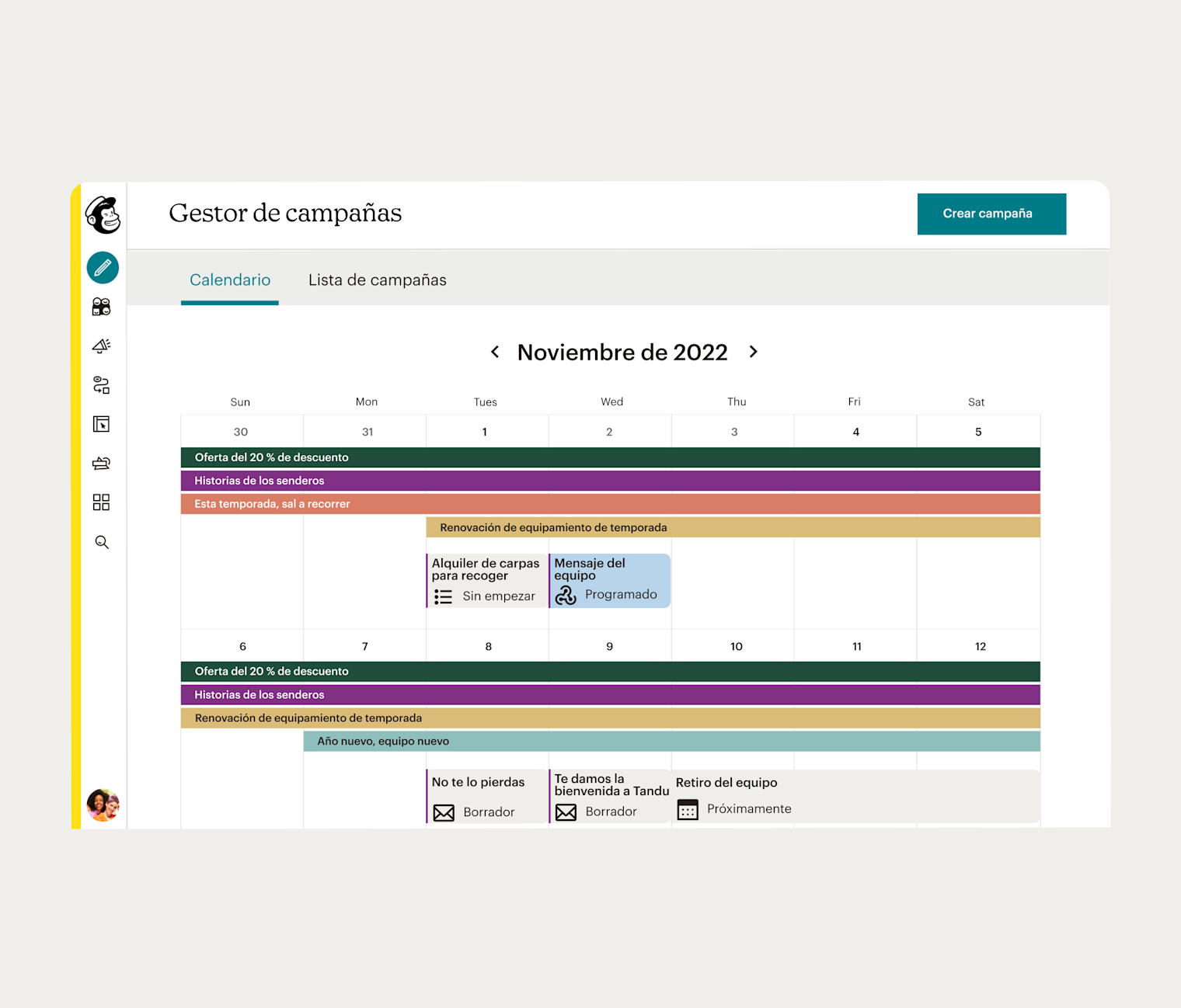El Gestor de campañas de Mailchimp te permite crear campañas a través de múltiples canales y gestionarlas todas desde una plataforma unificada.