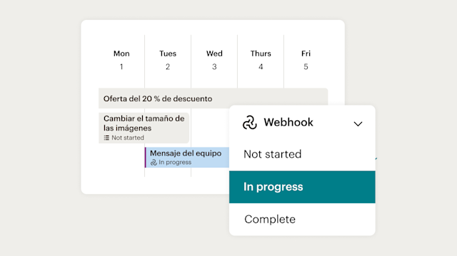 Los webhooks te permiten programar o automatizar acciones utilizando tus herramientas favoritas, para que puedas coordinar las interacciones con los clientes, los lanzamientos de campañas, las actualizaciones internas del equipo y mucho más, todo desde Mailchimp.