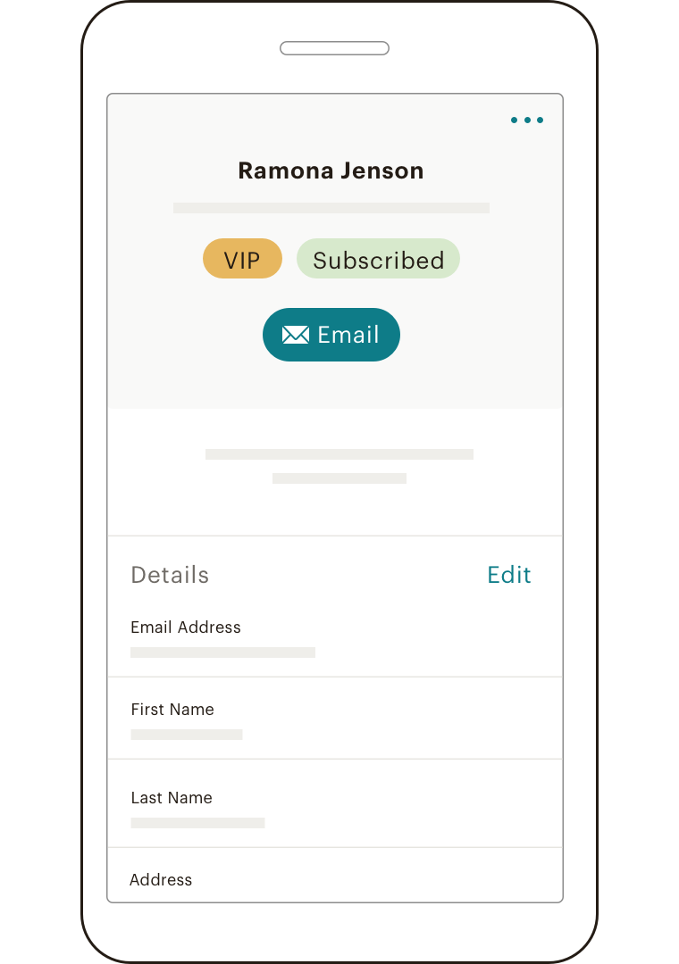 • When you create an audience in Mailchimp, every customer in that audience will be assigned a contact profile. You can open an individual’s contact profile to view all available information about them, such as previous purchases, engagement levels, marketing status, and more. Within an individual’s contact profile, you can also edit their information, add notes, assign tags, and make other changes as needed.