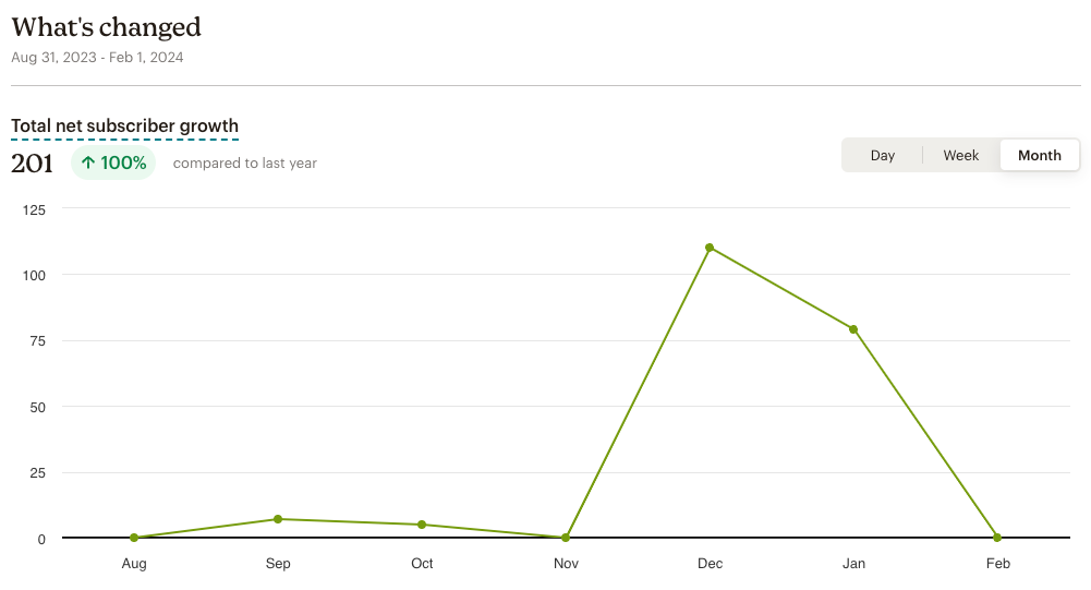 The What’s changed section shows the net growth of subscriptions. Net growth is the number of subscribed contacts for your selected date range minus any unsubscribed or removed contacts. Use the Day, Week, or Month view to customize the graph.