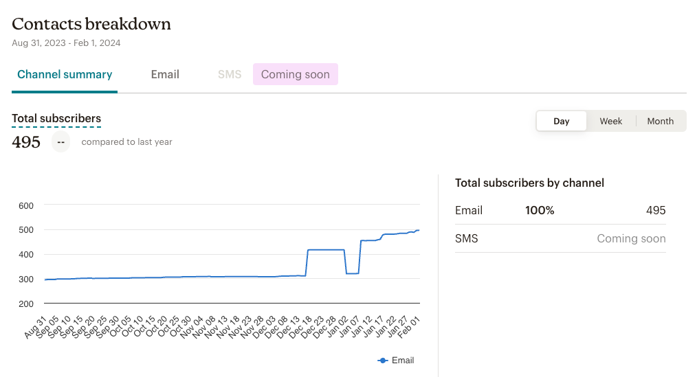 The Contacts over time section shows the total number of subscribed and unsubscribed contacts, as well as how many come from email and SMS. Use the Day, Week, or Month view to customize the graph.