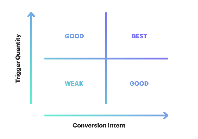 Les deux critères que Tim recommande pour choisir vos déclencheurs les plus efficaces sont la quantité et l'intention. Les déclencheurs fréquents qui envoient des automatisations marketing aux personnes très motivées rapportent le plus d'argent. Un e-mail d'anniversaire n'est envoyé qu'une fois par an, c'est donc un déclencheur de faible quantité. Les paniers abandonnés, en revanche, sont très fréquents. Une personne qui clique sur « Acheter » est beaucoup plus susceptible d'acheter un produit auprès de vous que quelqu'un qui a lu un communiqué de presse, ce qui fait de l'achat non terminé un déclencheur à haute conversion.