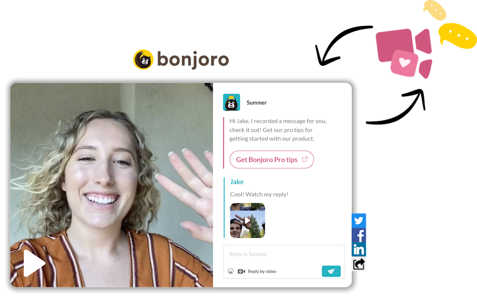 Bonjoro also allows you to easily gather, manage, and publish video or text customer testimonials all in one place. Create customer-friendly surveys to collect video and text testimonials with ease. Keep all of your testimonial assets in one place, so you and your whole team can access them easily. Embed testimonials into your site with our nu-fuss templates, or download them to add to your CMS.