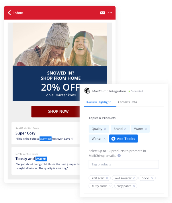 Utilizing an advanced AI algorithm, Yotpo's integration with Mailchimp automatically identifies your best reviews, extracts top customer quotes, and displays them in an eye-catching in-mail widget that's easy to set up. Connecting Yotpo user-generated data to your contacts will allow you to view how many reviews each contact wrote, including the review score and content, helping you create richer segments and trigger campaigns through Mailchimp.