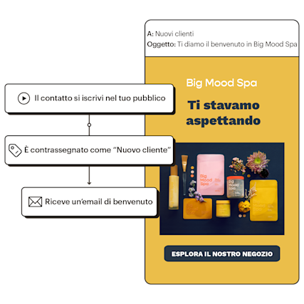 Ora che sai cosa piace al tuo pubblico, puoi creare messaggi automatizzati su misura per i loro comportamenti e le loro preferenze. Il nostro Customer Journey Builder ti permette di creare percorsi a livello visivo per inviare messaggi pertinenti sulla base di tag. Per esempio, puoi applicare un tag a un nuovo cliente e avviare un percorso di benvenuto al momento dell’applicazione.