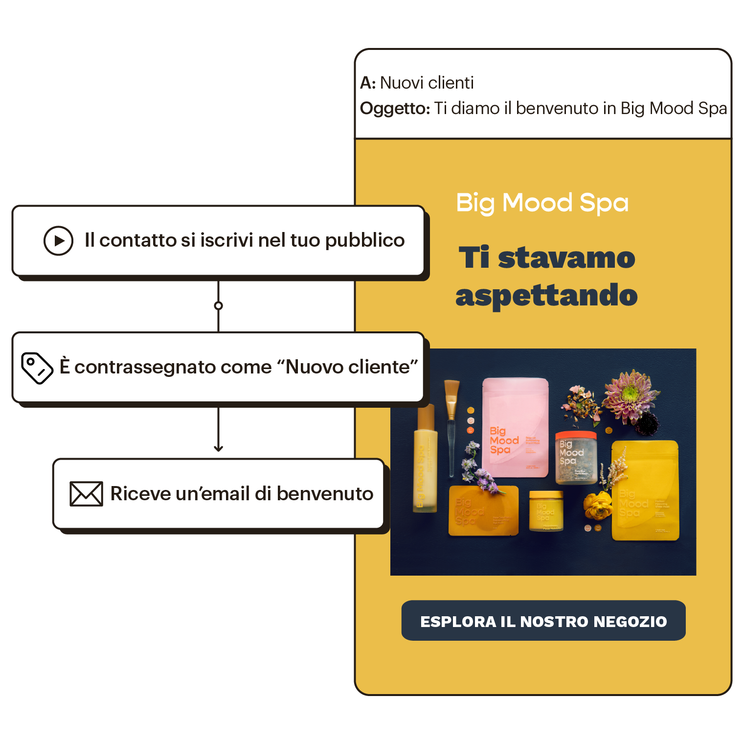 Ora che sai cosa piace al tuo pubblico, puoi creare messaggi automatizzati su misura per i loro comportamenti e le loro preferenze. Il nostro Customer Journey Builder ti permette di creare percorsi a livello visivo per inviare messaggi pertinenti sulla base di tag. Per esempio, puoi applicare un tag a un nuovo cliente e avviare un percorso di benvenuto al momento dell’applicazione.
