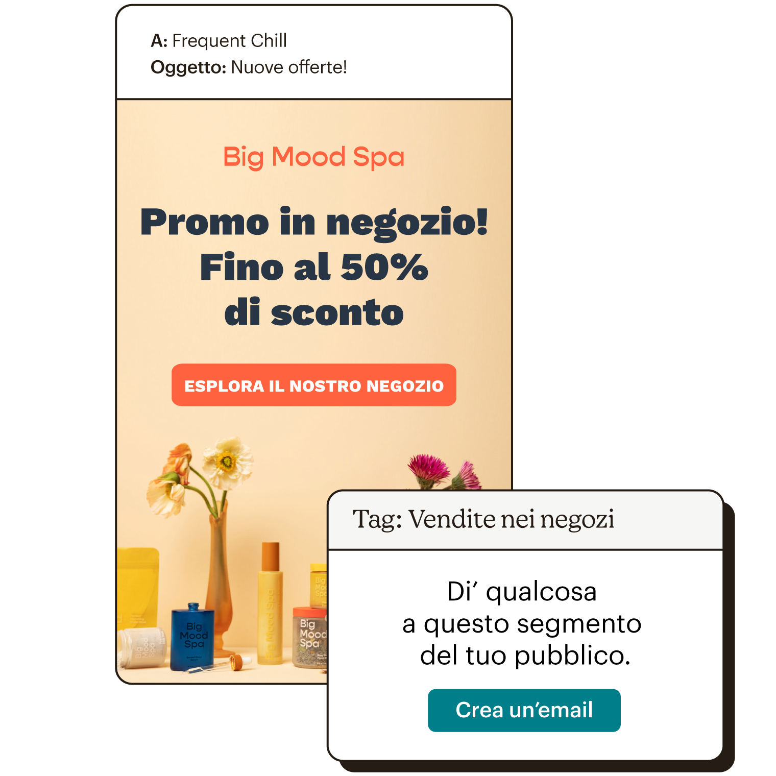 Quando colleghi il tuo negozio Shopify a Mailchimp, puoi aggiungere facilmente dei tag personalizzati per organizzare i tuoi contatti e creare segmenti di pubblico. In questo modo, puoi assicurarti che i tuoi contatti ricevano il contenuto che desiderano effettivamente vedere.