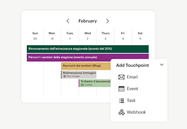 Tieni traccia di ogni attività e obiettivo quando pianifichi campagne per i social media su più piattaforme. Gestione della campagna ti consente di unificare le tue iniziative di marketing omnicanale e di visualizzarle in un'unica sequenza temporale.