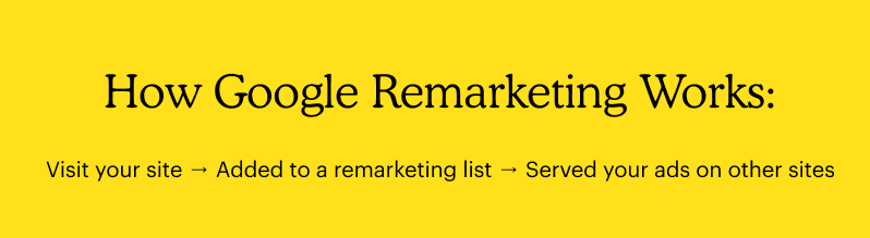 Also called retargeting, Google remarketing is the technology that enables your Google Ads to follow potential customers as they move across the internet. When a user visits, a small snippet of code (remarketing code) on your website adds them to a remarketing list. Then when they visit another website that uses the Google Ad network, they are served your ad. Google allows you to customize who sees your remarketed ads. For example, you can prioritize new or returning customers.