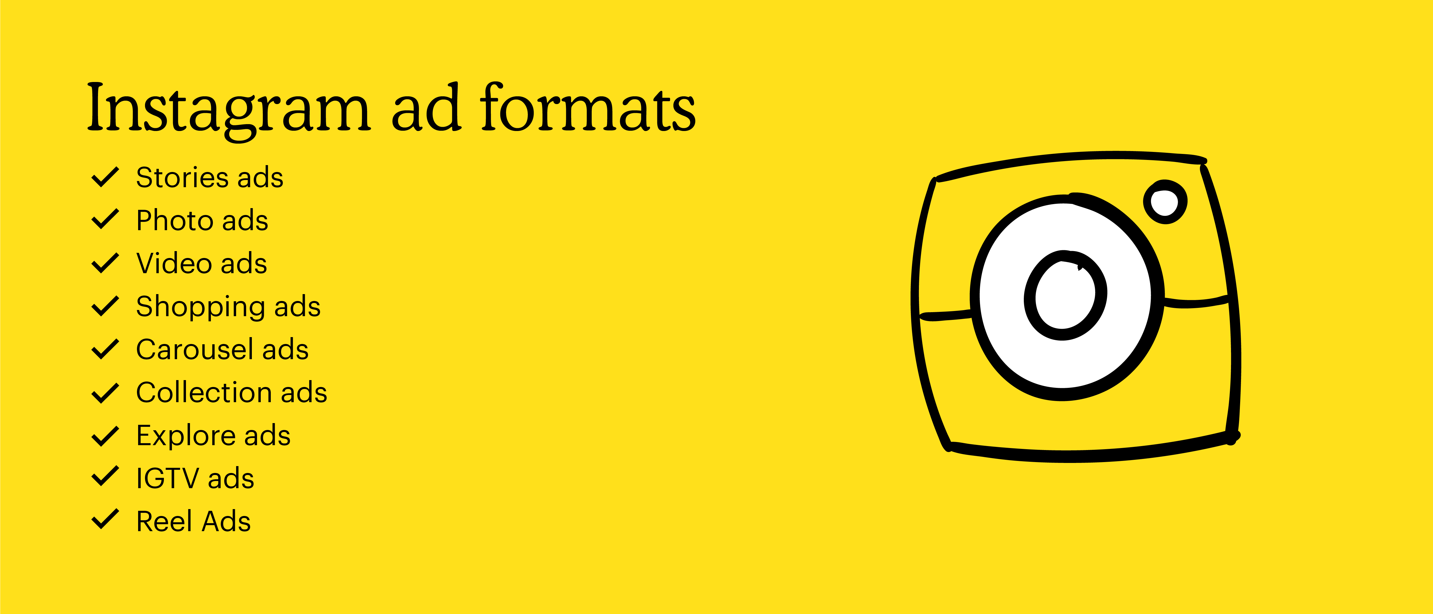 - Instagram offers various ad formats, including Stories, Photo, Video, Carousel, Shopping, Collection, Explore, IGTV, and Reels ads.