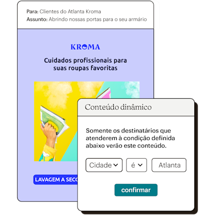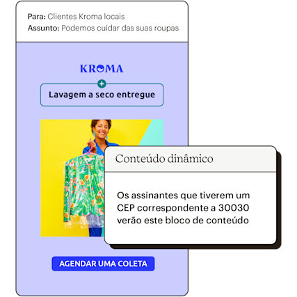O conteúdo dinâmico do marketing por e-mail garante que o conteúdo certo seja mostrado às pessoas certas e que cada mensagem enviada seja personalizada, mesmo que seja enviada em massa. Isso significa que você não precisa criar um novo e-mail ou enviar uma mensagem de acompanhamento para conteúdos que deseja que apenas alguns contatos vejam. Se você quiser fornecer um código promocional para clientes em determinadas regiões ou exibir novos produtos para faixas etárias específicas, nós podemos ajudar.