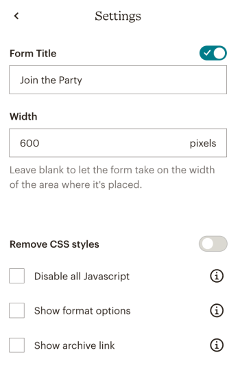 Adicione um título de formulário ou a largura de formulário desejada. Você também pode gerenciar outras configurações do formulário, como JavaScript, opções de formato do e-mail e o link do arquivo da campanha.