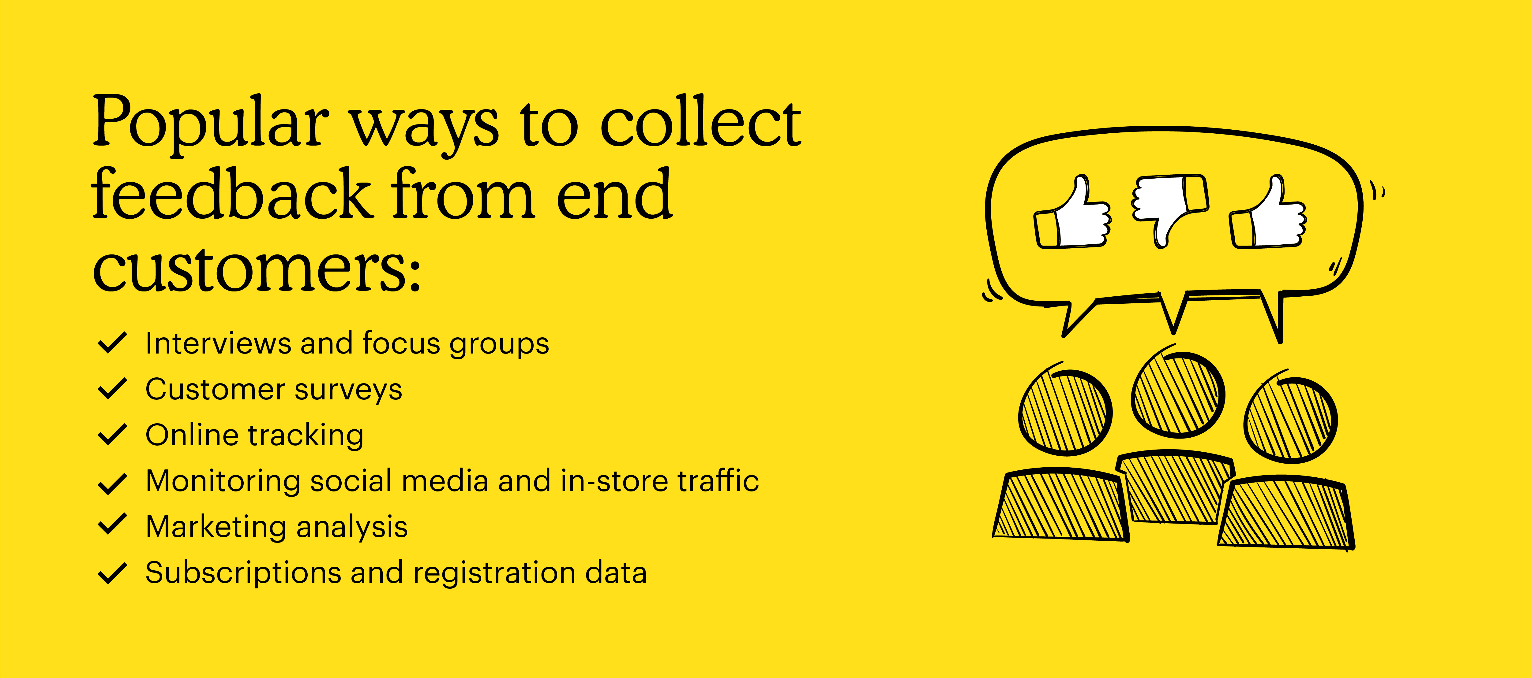 Os usuários finais podem fornecer feedback de várias maneiras. Você pode coletar informações qualitativas e quantitativas. Por exemplo, você pode interagir diretamente com eles, como por meio de entrevistas. Métodos mais indiretos podem incluir o monitoramento de redes sociais.