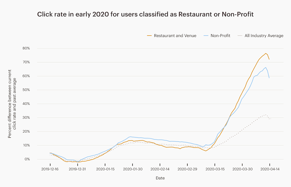 Restaurants and nonprofits have seen a sharp increase in email engagement. The increase might suggest restaurants with an online presence are successfully pivoting to delivery or take-out orders. For nonprofits also seeing a spike in engagement, it’s a good time to let your audience know how they can support you or take advantage of your services.