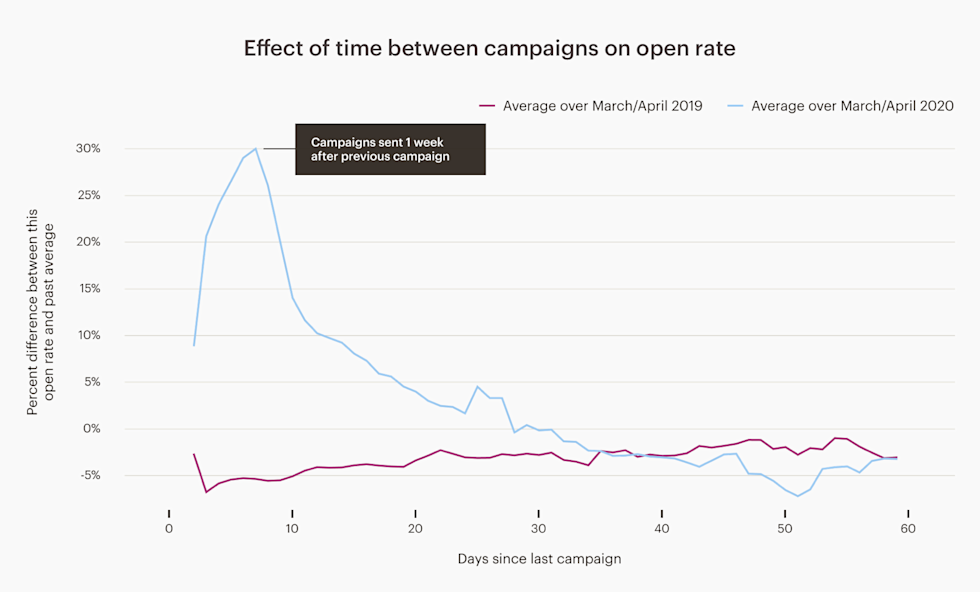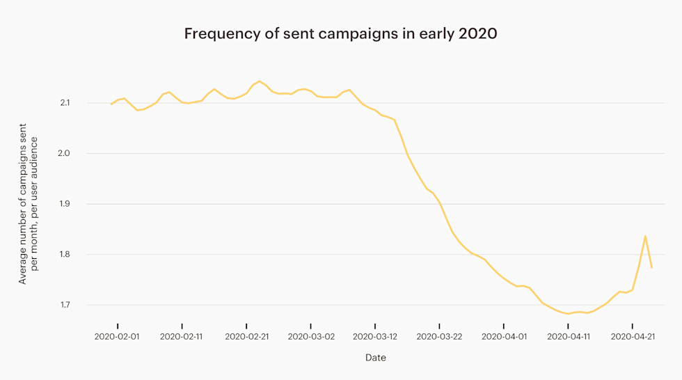 As the world struggled to adjust to new circumstances in early March, email campaigns became less frequent than usual. The frequency of sending campaigns went down from roughly 2 campaigns a month (a campaign every 14 days) to a lowest point of about 1.5 campaigns per month (a campaign every 20 days).