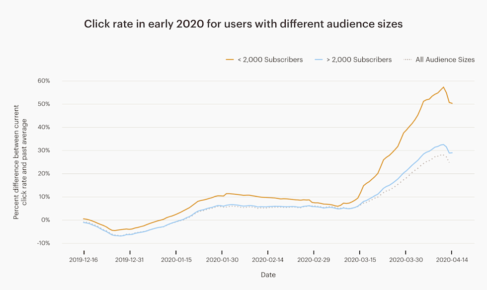 The plot below shows the percent change in average engagement activity for all active Mailchimp users from January 2019 until April 2020. We can see click and open rates in March and April 2020 are higher than they were throughout all of 2019.