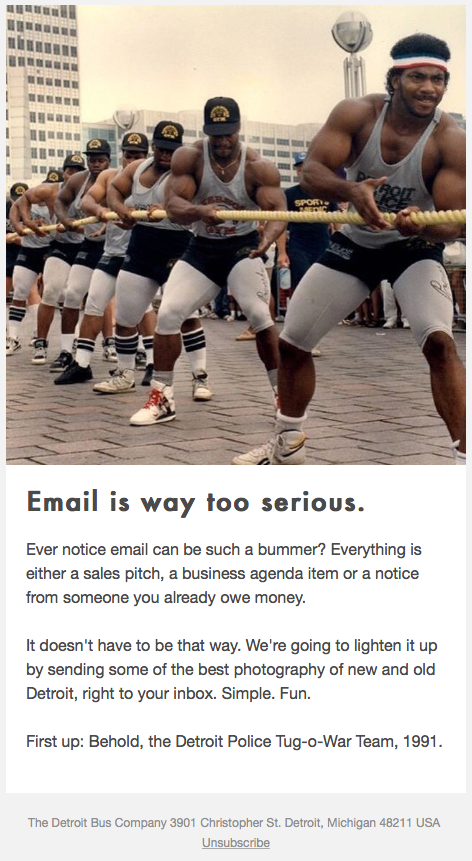In recent campaigns, The Detroit Bus Company has shared its year-end report, launched a transit survey, and kicked off a major fundraiser. Recently, Didorosi also began experimenting with Mailchimp Snap to send on-the-go, photo-based updates—a perfect fit for a guy who’s literally on-the-go.