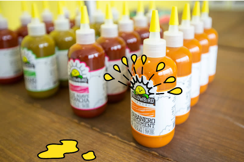 Yellowbird’s current lineup of fiery selections includes Jalapeño, Blue Agave Sriracha, Serrano, and Ghost Pepper flavors. [Spoiler alert: They’re all delicious.] Their bottles—which feature the brand’s fierce-but-pint-sized mascot—have made a home on shelves in natural food retailers across the U.S., including Whole Foods and Sprouts. As far as the daily duties, George works on developing and fine-tuning recipes and managing production, while Erin tackles all of the customer-facing duties, including marketing and sales.