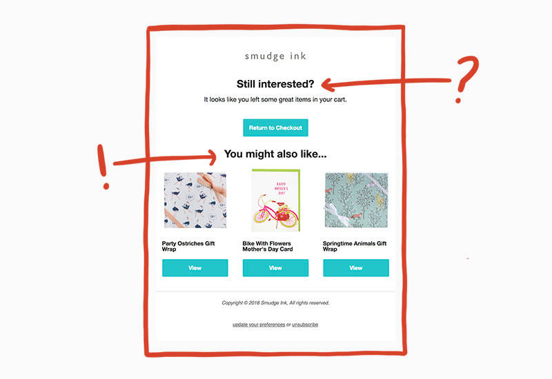 When customers leave items hanging in purchase limbo, Smudge Ink uses Mailchimp's personalized product recommendations feature for the bait. Not only is Smudge Ink sending those personalized product recommendations to highlight new or popular products, it’s also a part of their abandoned cart strategy.