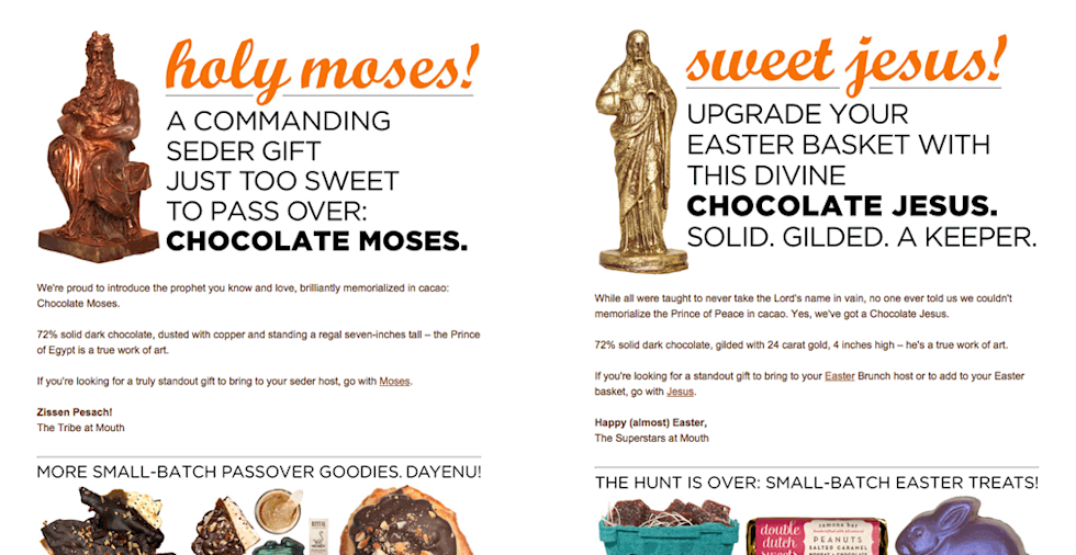 They also try to leave room for experimentation. That’s when things can really get fun, and where some of their more successful campaigns are born. Last year, when Easter and Passover rolled around, the Mouth team had both chocolate Jesuses and Moseses in their collection of holiday treats. In an effort to be inclusive, they decided to send both campaigns side by side. Some might see this move as counterintuitive: Isn’t this what segmentation is for? But the emails complemented to each other, and instead of an uptick in unsubscribes, Mouth saw a rise in opens and clicks. Their willingness to take a risk paid off, and they duplicated the approach with Hanukkah and Christmas, New Year’s resolutions and unresolutions, and other select times when contradictory messages are fun when delivered at the same time.